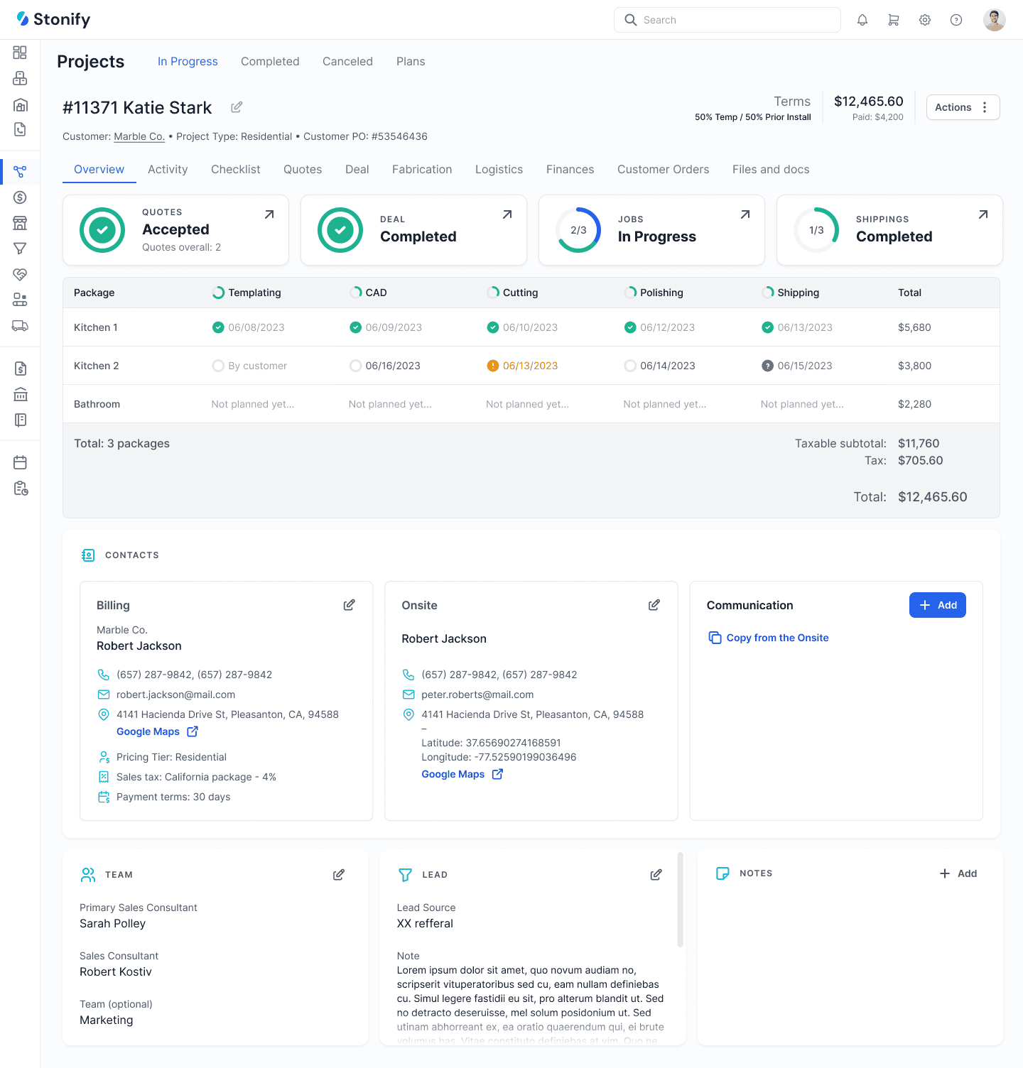 Stonify has turned all of our ideas into reality. Instead of relying on several separate spreadsheets and apps, we now manage inventory and project tracking through a single unified platform. We can follow each step of our process—from quoting and lead management to project creation and progress tracking—all within one system.
