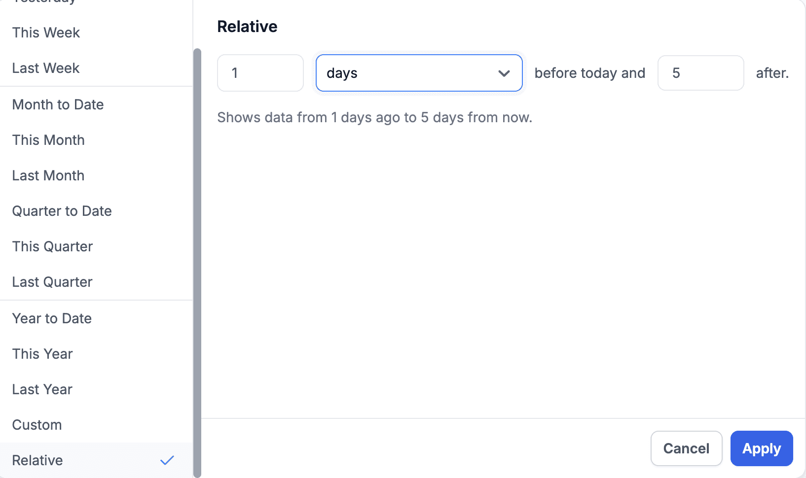 The date range picker now includes a relative date filter, allowing you to easily set ranges like Last 7 days.