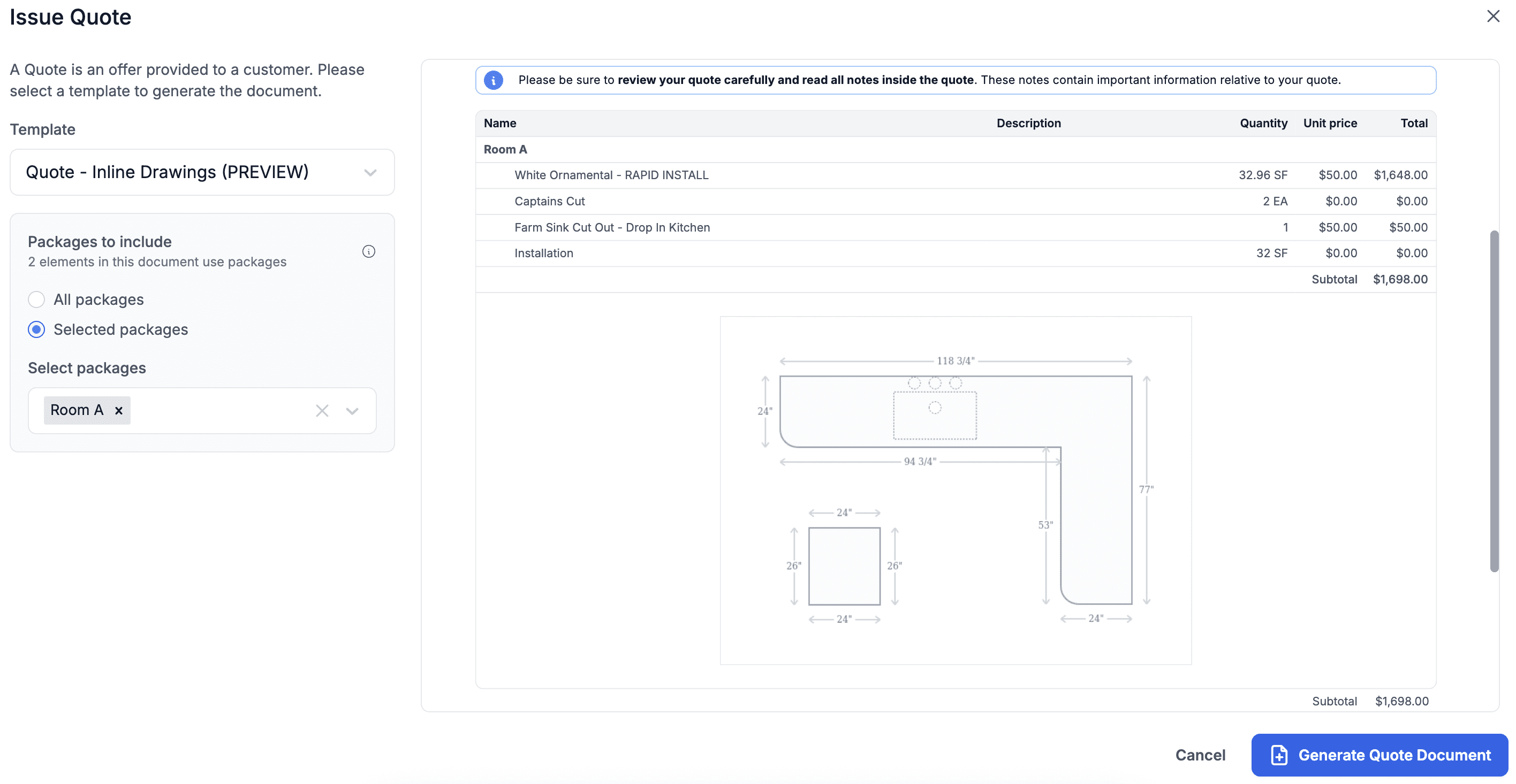 You will also notice a new way of generating Quotes. This gives you a preview of the future direction, where each document can be customized at the moment it’s generated—allowing you to make quick adjustments without changing the underlying document settings.