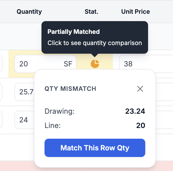 In Step 6, lines now have a quick way to resolve quantity mismatches between quote lines and the drawing.
